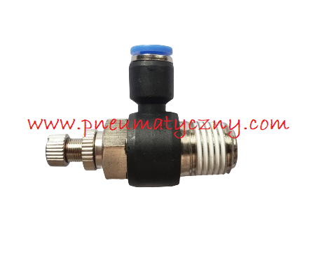 Złączka pneumatyczna wtykowa zawór zwrotno dławiący kątowy do węża 4 mm x przyłącze 1/4″ GZ.